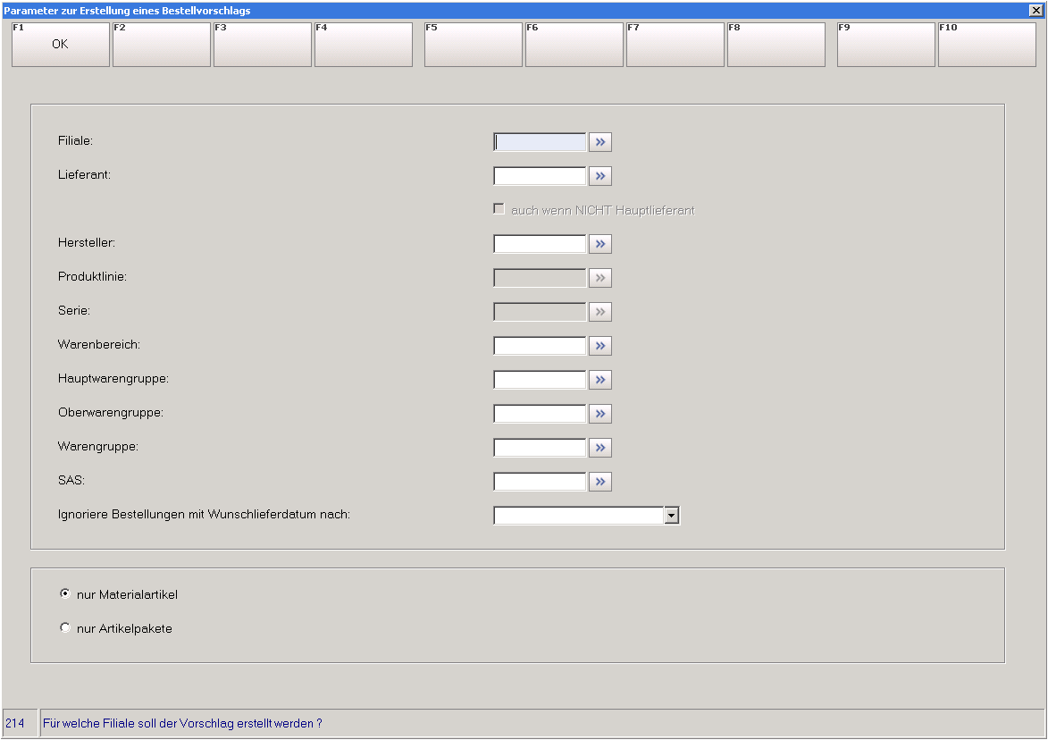 Um Bestellungen anhand hinterlegter Bestellzeitpunkte ermitteln zu lassen, wählen Sie Vorschlagsliste (F5). Danach wählen Sie Parameter aus, welche Artikel bestellt werden sollen. Die Felder "Filiale" und "Lieferant" sind Pflichtfelder und müssen ausgefüllt werden. Mit den weiteren Feldern kann die Artikel-Auswahl eingeschränkt werden.