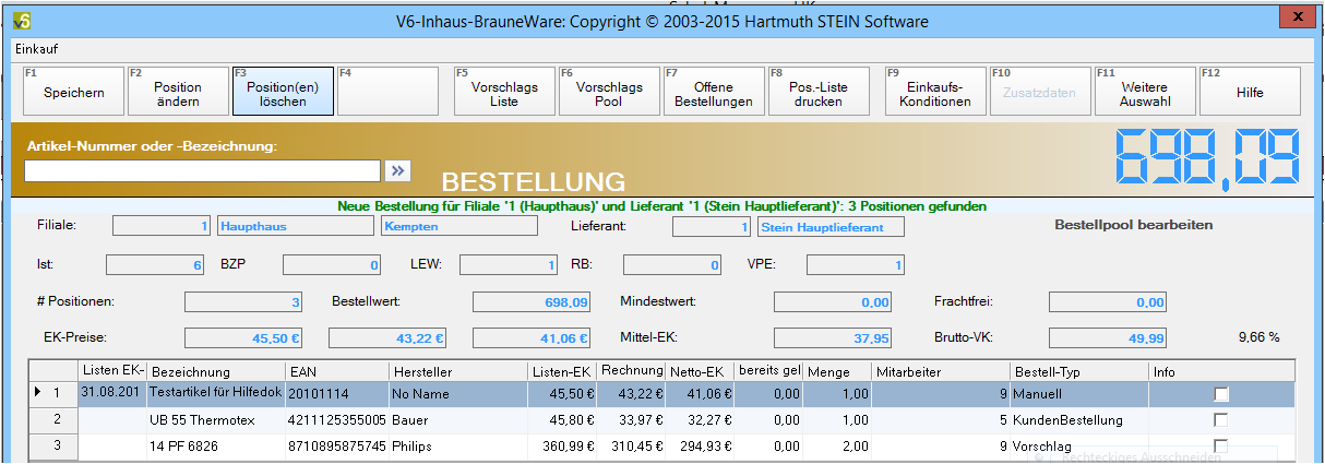 Mit Bestellung erzeugen (F1) wandeln Sie den Bestellvorschlag endgültig in eine Bestellung um, mit Best-Posis. speichern (F2) wird der Bestellvorschlag nur gespeichert ohne eine Bestellung zu erzeugen: