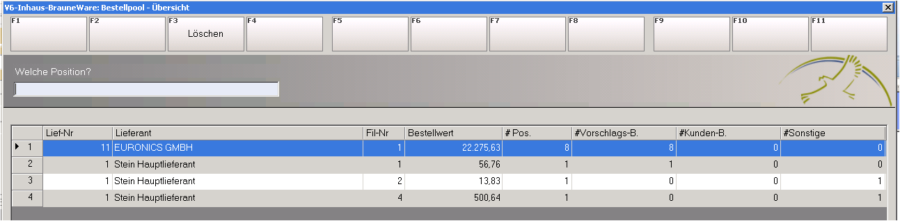 Nach Wahl von Vorschlagspool (F6) erscheint eine Liste aller im Pool vorhandenen Bestellvorschläge sortiert nach Lieferant.