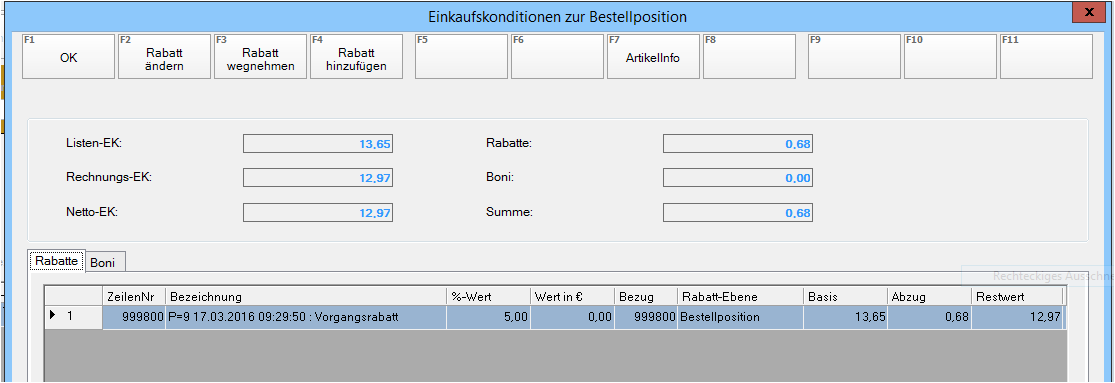 Mit der Funktion Einkaufskonditionen (F9) auf Bestellpositionsebene können Sie den Rabatt einsehen: