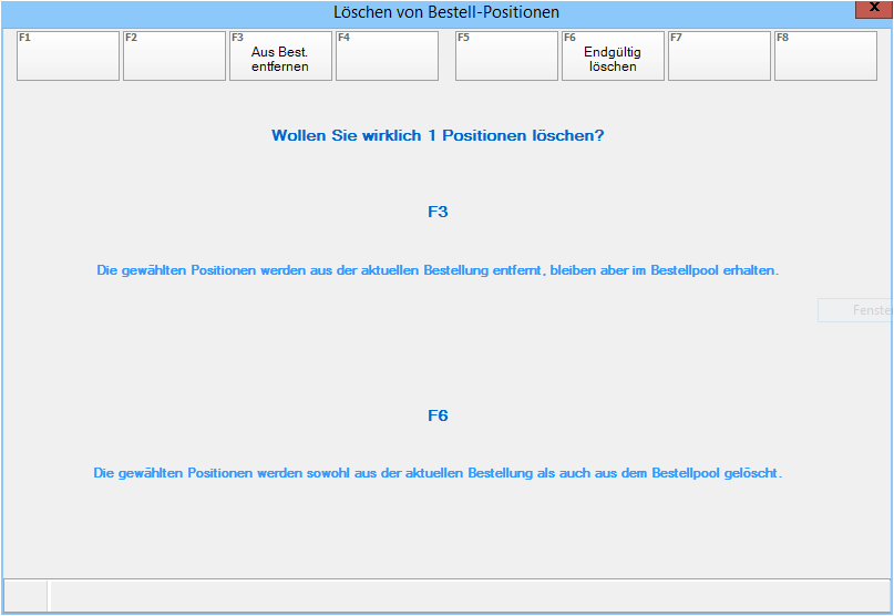 F3 löscht die Position nur aus der aktuellen Bestellung. Im Vorschlags-Pool bleibt sie erhalten und es kann erneut eine Bestellung dafür erzeugt werden. F6 löscht die Position auch aus dem Vorschlagspool. Um den Artikel erneut zu bestellen, muss erst wieder ein Bestellvorschlag erzeugt werden.