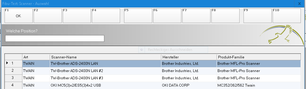 Nach Auswahl von Scannen (F4) können Sie mit Erfassen (F4) einen Scanner für V6 erfassen (wie bei der Druckerverwaltung muss der Scanner in Windows verfügbar sein). Die in Windows verfügbaren Scanner werden angezeigt (wird kein Scanner angeboten, ist auf Ihrem Rechner noch kein Scanner installiert. Wenden Sie sich hierzu an Ihren lokalen IT-Verantwortlichen):