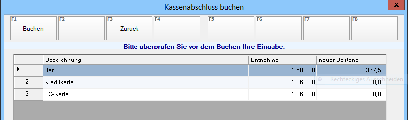 Beenden Sie dann den Kassenabschluss mit Buchen (F1). V6 druckt automatisch einen Kassensturz-Beleg und wenn Sie Entnahmen vorgenommen haben auch einen Entnahme-Beleg.