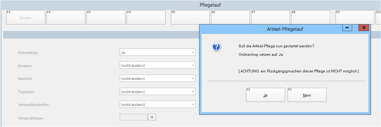 F9 Verwaltung Allgemein - F6 Onlineshop - F2 Artikelpflege - F1 Manuelle Pflege - Auswahl - F1 OK - F11 Pflegelauf